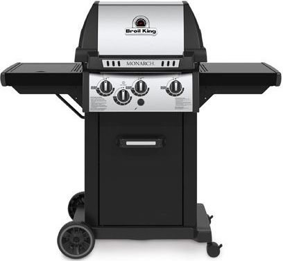 The Monarch™ 340 features 330 sq. in. primary cooking surface and includes 3 stainless steel Dual-Tube™ burners, reversible heavy-duty cast iron cooking grids, stainless steel Flav-R-Wave™ cooking system, and electronic ignition. The Monarch™ 340 features painted steel drop-down side shelves and enclosed cabinet base.