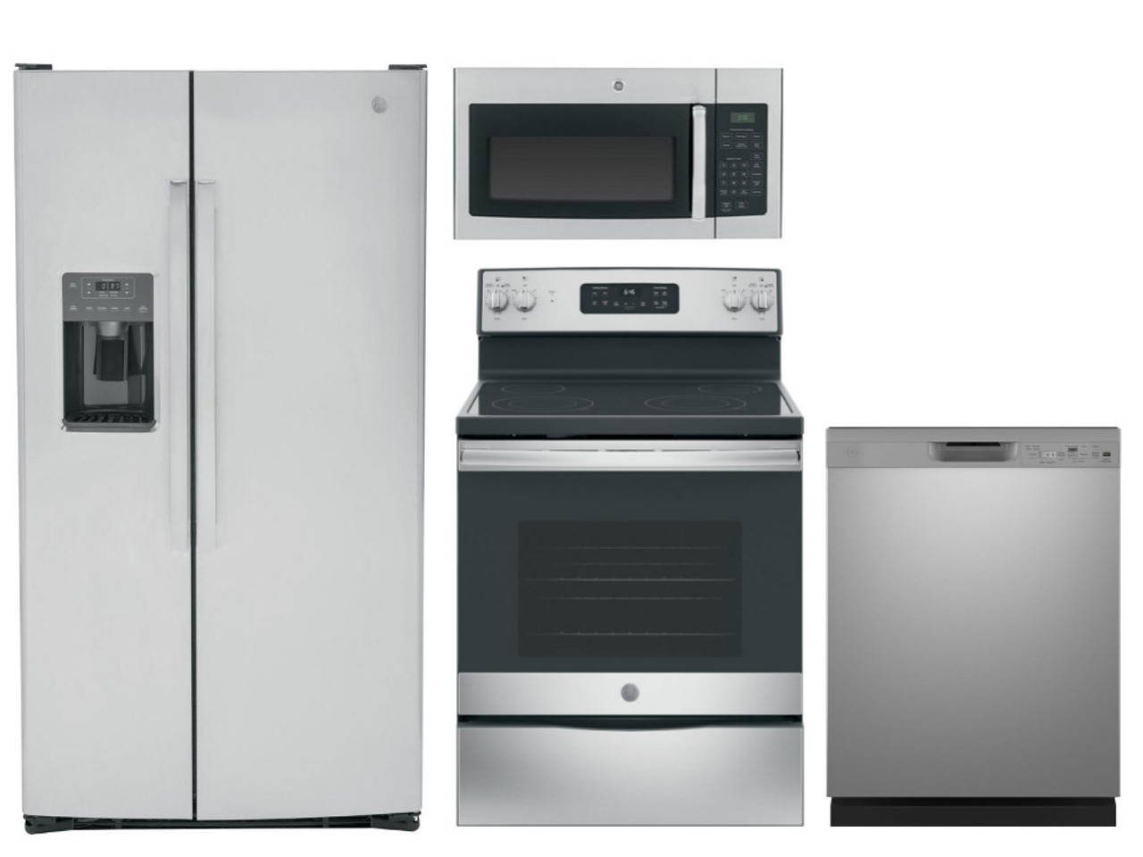 STYLE MEETS VALUE WITH THIS 4-PIECE KITCHEN PACKAGE FROM GE. 25 CuFt SIDE BY SIDE REFRIGERATOR WITH ICE AND WATER DISPENSOR SELF CLEANING ELECTRIC RANGE DISHWASHER WITH STEA, AND FAN ASSIST DRYING 1.6 CuFt OVER THE RANGE MICROWAVE WITH 300 CFM VENTILATION.Read More