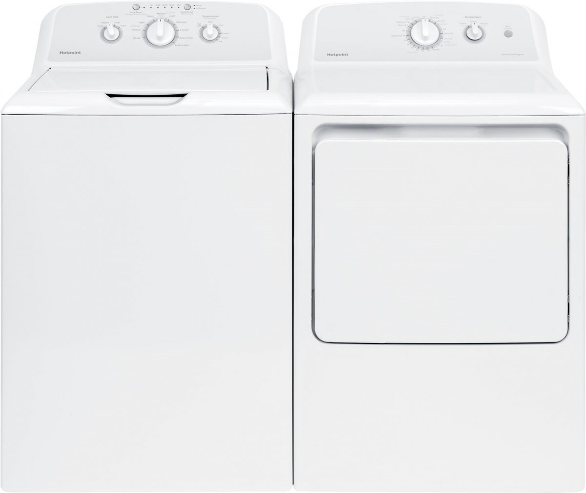 Hotpoint® White Laundry Pair with a 3.8 cu. ft. capacity top load washer and a 6.2 cu. ft. capacity front load electric dryer.Read More
